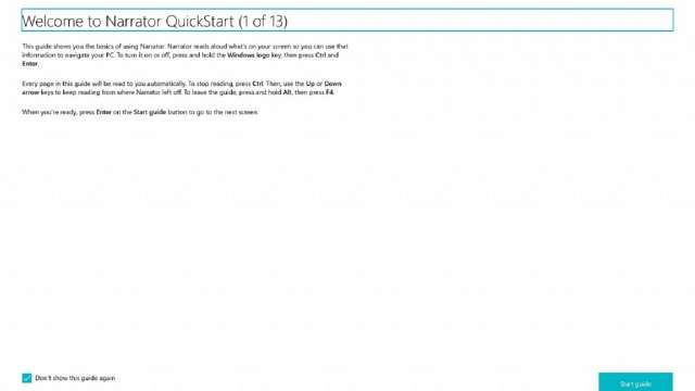The keyboard has been renovated to be more recognizable to those already accustomed to screen readers. Modified commands are designed to be more intuitive. For example, you can now search for content with a Narrator Find command that allows the user to search for specific text, not unlike control + f. Also to simplify locating particular content, Narrator compiles a list of objects on a page, like links, headings, or other distinguishable subjects so you can navigate through the material faster and filter out irrelevant content. Narrator will also hesitate on interactive elements while reading, but if you don't want to select that element, you can easily bypass it by pressing the down arrow on the keyboard.